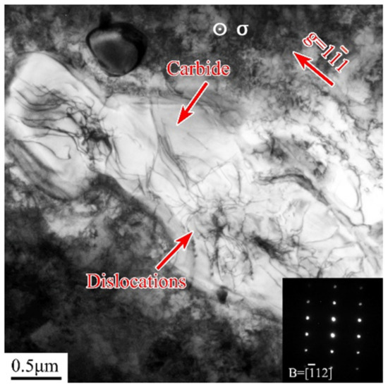 Sub-microstructure morphologies in the tensile specimens were also investigated systematically. Figure 7a,d are TEM images of typical dislocation configurations in the dendrite cores at the cross sections that are close to the fracture surface of the DZ406 superalloy at −125 °C. Figure 7a shows that multiple slip bands were observed in the fracture microstructure when tested at −125 °C, and the slip band crossed through several γ′ precipitates. A large number of dislocations had been produced in the microstructure, most of them were packed in the γ channel, and some dislocations had been cut in the γ′ precipitates (Figure 7d).