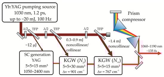 The anisotropic KGW crystal exhibits several intense spontaneous Raman vibrations that can be excited along different crystal axes. The most intense adjacent Stokes lines at 767 cm−1 (Ng-axis) and 901 cm−1 (Nm-axis) can be excited in successive TSRCPA stages. A short dephasing time of several picoseconds [] and a large Raman gain [] distinguish this material favorably upon the SRS conversion of ~1 ps pulses with significant spectral broadening []. The Yb:YAG chirped-pulse amplifier [] used in the experiments delivered ~1.2 ps (FWHM) transform-limited pulses with an energy of 20 mJ at a repetition rate of 100 Hz (Figure 1). A small portion (~12 µJ) of the laser pulse energy was directed to an undoped YAG rod 15 mm long to obtain stable SC pulses in the wavelength range from 1050 to 2400 nm []. These SC pulses were used to seed the first TSRCPA stage. Laser pulses with energies up to 2.5 mJ after passing through optical delay lines were used to pump two successive TSRCPA stages based on Np-cut KGW crystals 30 mm and 15 mm long, tuned to vibrational modes at 901 and 767 cm−1, respectively. To reveal the features of TSRCPA in collinear and noncollinear configurations, seed and pump pulses were combined in KGW crystals at a small angle or propagated collinearly at constant beam diameters. As before [], a glass diffuser was placed in front of a spectrum analyzer (Anritsu MS9740B) to homogenize the Stokes radiation, and the beam profiles were measured using a CMOS profilometer (DataRay WinCamD-LCM). The possibility of compressing amplified pulses was tested using SF11 prisms with an apex angle of 59° spaced 2.1 m apart to compensate for positive dispersion in YAG and KGW crystals. The amplified and compressed Stokes pulses were characterized using home-built second harmonic generation frequency-resolved optical gating (SHG-FROG) with 100 µm thick beta-barium borate (BBO).