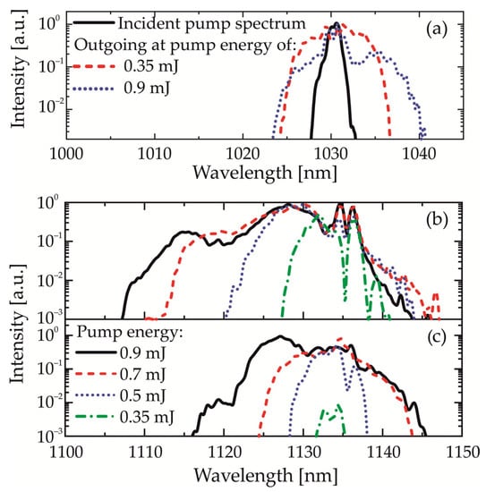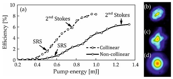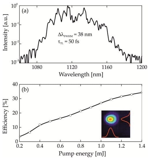 A conversion efficiency 35% was achieved (Figure 5b) at a pump pulse energy of 1.4 mJ, corresponding to 30 GW/cm2. Obviously, due to the large mismatch between the center wavelengths, adjacent wings of the synthesized spectrum are amplified independently. As a result, the conversion efficiency was lower compared to the amplification of a single Stokes component in two successive TSRCPA stages []. Indeed, additional amplification stages or a multi-pass cell (MPC) can be used to further improve conversion efficiency [].