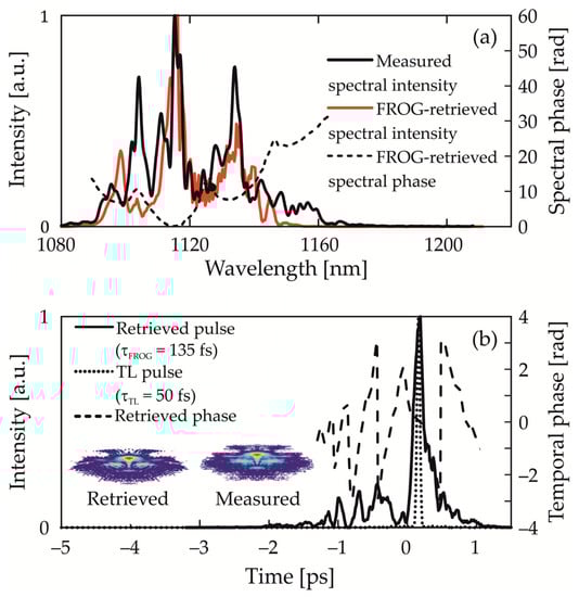 The measured spectrum, the FROG-retrieved spectrum, and its phase for the amplified pulse after spectral synthesis in a two-stage amplifier are shown in Figure 6a. It can be seen that the synthesized pulse has a positive chirp imprinted from supercontinuum pulses, which is accompanied by significant spectral phase modulations (Figure 6a—dashed line). Unfortunately, we cannot pinpoint exactly what caused the phase modulations. We assume that the phase distortions of the pump pulse caused by the SPM are transmitted to the Stokes pulses during amplification. The B-integral of the pump radiation accumulated in the first TSRCPA stage exceeded 9, which certainly affects the amplified Stokes phase structure. Meanwhile, in the second stage, the B-integral did not exceed 3; therefore, the spectral phase structures of adjacent Stokes modes induced by the SPM were different. In addition, Stokes SPM during amplification can also have some effect on the spectral phase distortions of the amplified signal. After two TSRCPA stages, a synthesized pulse width of ~1 ps was observed. Despite the fact that the synthesized pulse has an inhomogeneous spectral phase, it is of interest to be able to compress it to at least ~100 fs. The delay in the second stage was optimized to compress the pulse with the best contrast. Otherwise, two zones can be observed in the temporal profile of the compressed Stokes pulse.