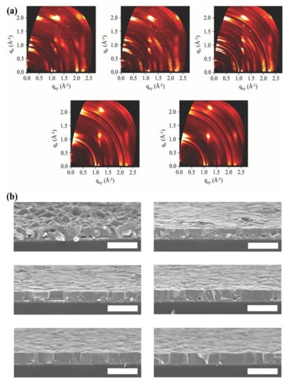 Stage I was the precursor solution period; stage II was the main δ-phase (2H); and stage III contained the multiple complex phases, including two hexagonal polytypes (4H, 6H), CH3NH3I (MAI)–PbI2–Dimethyl sulfoxide (DMSO) intermediate phases and the α-phase. The crystalline phase of the perovskite showed stronger diffraction intensities and orientations when annealing at stage II, suggesting an internally stable and symmetrical structure. Actually, choosing to anneal within the annealing window could avoid the formation of hexagonal polytypes during the perovskite crystallization process. Furthermore, the annealing window can be extended by additional ions [55]. The time and temperature of the thermal annealing determines the quality of the crystals. The results of Huang et al. showed that the initial phase formed at 105 °C for 10 min, and the crystallinity and grain size continued to increase after 2 h of annealing [53]. However, prolonged thermal annealing may lead to decomposition of the film and device stability due to the fragility of the perovskite structure [58]. Some researchers have used high temperature rapid crystallization to solve the problem of long annealing times [18,59,60]. Annealing at high temperatures in a short time could induce the removal of solvent to build a supersaturation condition, which would accelerate the perovskite nucleation and improve the density of the nucleus [18]. Wei et al. demonstrated that annealing temperature played a key role in controlling the coarsening of the perovskite grains. The grain boundary was almost perpendicular to the substrate as the film was treated at 250 °C for 10 s (Figure 5).