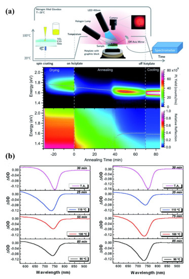 (a) Schematic of the glovebox-based synthesis and optical monitoring process, a camera image of the photoluminescence emitted from the sample after 60 min annealing shown in red colors is shown as an inset, a false-color plot of the evolution of photoluminescence (PL), and the reflection spectra during the 3-stage synthesis of chlorine-derived MAPbI3−xClx. (Reprinted with permission from Ref. [29]. Copyright 2020 Royal Society of Chemistry). (b) Typical TAS spectra of ΔOD as a function of wavelength at t = 0 ps, for 90, 100 and 110 °C, and Glass/ITO/PEDOT: PSS/MAPbI3 and for Glass/ITO/PTAA/MAPbI3. Reprinted with permission from Ref. [30]. Copyright 2019 Royal Society of Chemistry.