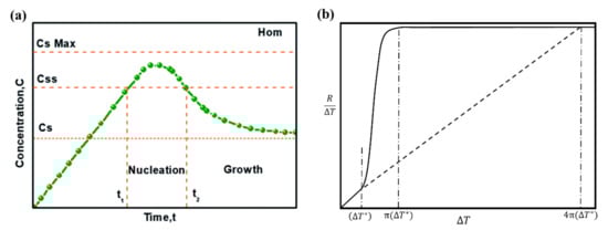 (a) LaMer diagram depicting the nucleation and growth dynamics. (Reprinted with permission from Ref. [44]. Copyright 1950 American Chemical Society). (b) Theoretically predicted growth rate curve for surfaces. Reprinted with permission from Ref. [47]. Copyright 1964 Elsevier Ltd.