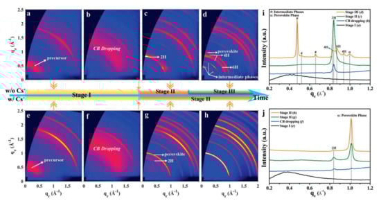 Different crystallization stages versus spinning time for perovskite formations without and with Cs+ (a–d); 2D GIWAXS patterns at different crystallization stages for films without Cs+ and with 10% Cs+ (e–h); (i,j) the intensity profiles along the qz direction for films without Cs+ (i) and with 10% Cs+ (j). Reprinted with permission from Ref. [56]. Copyright 2019 John Wiley & Sons.