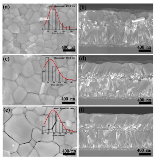 Surface (left) and cross-sectional (right) SEM images of the MAPbI3 perovskite films annealed at different temperatures. (a,b) 100 °C for 20 min; (c,d) 175 °C for 60 s; (e,f) 250 °C for 10 s; insets show the grain distribution of the corresponding perovskite films. Reprinted with permission from Ref. [18]. Copyright 2018 Elsevier B.V.