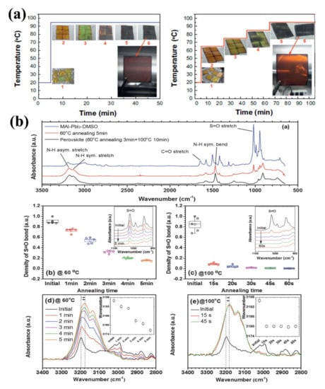 (a) The two different annealing methods adopted for the treatment of MAPbI3−xClx perovskite films: one-step and multi-step methods. (Reprinted with permission from Ref. [62]. Copyright 2015 Elsevier B.V.). (b) FTIR spectra to reveal the evolution of DMSO in an MAI-PbI2-DMSO intermediate film at 60 and 100 °C. Reprinted with permission from Ref. [63]. Copyright 2018 Wiley-VCH GmbH.