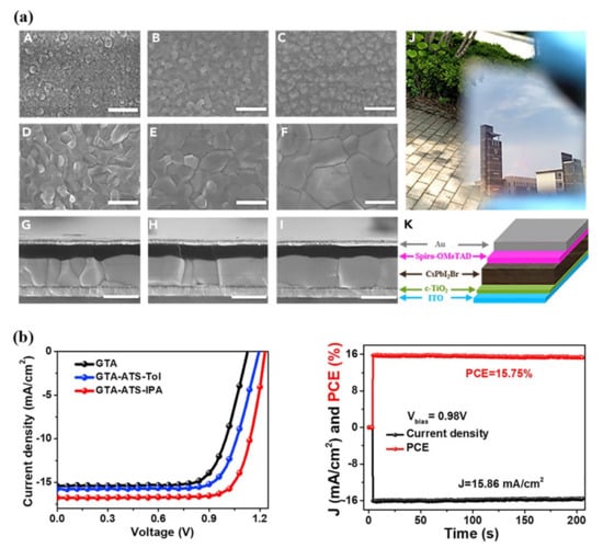 (a) The SEM images of the GTA, GTA-ATS-Tol, and GTA-ATS-IPA CsPbI2Br films: after pre-annealing process, 50 °C/1 min, 100 °C/1 min, and 160 °C/10 min; cross-section SEM images of the photograph of the mirror-like GTA-ATS-IPA film; schematic view of PSCs; (b) J-V curves of the three PSCs. Reprinted with permission from Ref. [67]. 2015 Royal Society of Chemistry.