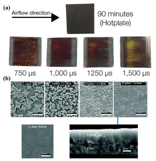 (a) Composed photograph of photonic annealed MAPbI3−xClx perovskite sample with increasing flash durations at 500 V lamp voltage as well as a film annealed in a hotplate. (Reprinted with permission from Ref. [81]. Copyright 2016 Royal Society of Chemistry). (b) SEM images of thin films annealed at four different flash pulses and the cross-sectional images of annealed CsPbI1.5Br1.5 at 25 pulses. Reprinted with permission from Ref. [82]. Copyright 2018 Wiley-VCH GmbH, Weinheim.