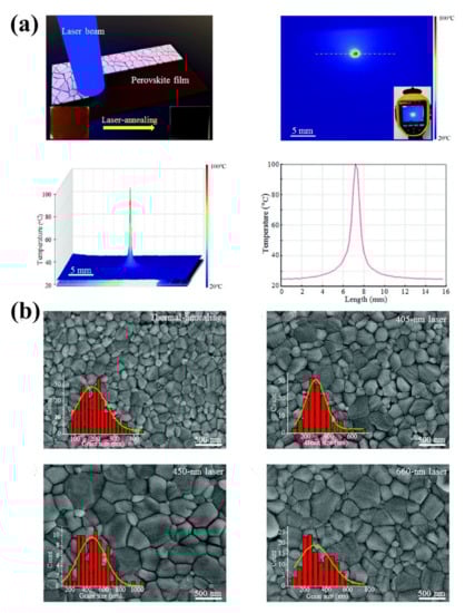 Lasers can provide a great strategy for modulating the crystallinity and electrical properties of films due to their high energy and excellent monochromatic characteristics, and are widely used in the fabrication of perovskite layers, such as the electron transport layer TiO2, the hole transport layer NiO, and the electrodes [73,91,92,93]. Lasers also perform well in the promotion of crystallization of the functional layers [23,94,95,96,97,98,99]. Compared to the pulsed light annealing discussed above, the laser had a remarkable ability to promote crystallization, and the efficiency of the device exceeded 20% [23]. The laser spot was scanned at a speed under the control of the program that produced a maximum temperature of 100 °C on the film surface (Figure 9a). Results from other researchers’ simulations also showed that the laser can generate temperatures of over 100 °C inside the film [94]. The films had superior crystallinity and orientation in the laser-driven mode. In addition, different wavelengths of laser light had different impacts on the growth of the films. The grains had a better grain size at 450 nm, probably due to the high absorption of perovskite at short wavelengths in the non-UV (Figure 9b). The researchers believed that the localized temperature gradient created by the laser at the perovskite grain boundaries would allow larger grains to absorb more energy and have higher temperatures than smaller grains, thus inducing selective growth of larger grains. The energy received by the film per unit time was related to the out-of-focus distance of the laser and the scanning speed, which would affect the properties of the crystal. The band gap narrowed under laser annealing and the PL peak was red-shifted [98]. In the laser approach, there is an inverse relationship between the scan speed and energy density. After receiving higher energy density in the low-speed mode of laser crystallization, the interaction between the organic cation and the inorganic frameworks of the film was enhanced, which resulted in the right shift in the conduction bands (CB) and valence bands (VB). The study also found that the conductivity of the perovskite surface would convert from P-type to N-type as the scan speed changed from high to low, which might be due to an increase in the conversion of perovskite. The laser annealing had a significant effect on stresses in thin film growth, where it can reduce tensile stresses during growth [96,98]. Regular thermal treatments will generate high tensile stresses within the film [100,101], causing perovskite to decompose, and promoting the formation of numerous defects, which adversely affected the carrier transport of defect trapping. The reduction in stress release comes from the fact that the laser enhanced ultrafast diffusion in the perovskite films. The 40% stress was reduced in the film by the laser, and the degradation rate of the film was cut down by more than two times at 80% humidity [96]. Laser annealing was equally applicable to flexible polymer substrates, which protected other functional layers from damage in the fabrication of flexible PSCs [94]. In addition, the compatibility between the different transport layers and the laser annealed film should also be taken into account for improving the device efficiency [95].