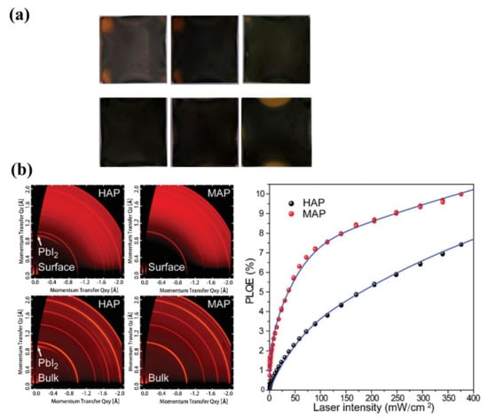 - Liu, C.; Wang, K.; Yi, C.; Shi, X.J.; Smith, A.W.; Gong, X.; Heeger, A.J. Efficient Perovskite Hybrid Photovoltaics via Alcohol-Vapor Annealing Treatment. Adv. Funct. Mater. 2016, 26, 101–110. [Google Scholar] [CrossRef]