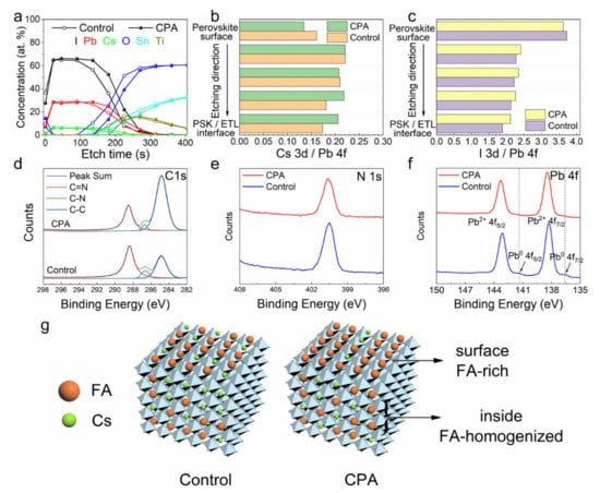 (a) XPS depth profiling of the control and CPA half devices with the structure of FTO/TiO2/SnO2/Cs0.1FA0.9PbI3; (b,c) Evolution of the atomic ratios of Cs 3d/Pb 4f and I 3d/Pb 4f with different etching depths; (d–f) XPS spectra of C 1s, N 1s, Pb 4f in control and CPA annealing modes; (g) schematic of the surface molecular structure of control and CPA perovskite films and the distribution of A-site atoms. Reprinted with permission from Ref. [125]. Copyright 2020 American Chemical Society.