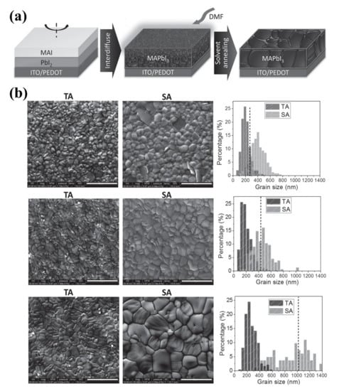 Solvent annealing for crystalline modulation is achieved by the addition of polar solvent vapor to the annealing [130,131,132,133,134,135,136,137]. Solvent annealing (SA) was first introduced to the perovskite crystallization by Huang et al. [21]. The organic polar solvent vapor provided a humid environment, and the high solubility of PbI2 and MAI in DMF vapor resulted in longer diffusion distances for precursor ions and molecules than in thermal annealing (TA), which promoted grain growth and produced larger grain sizes (Figure 13a).