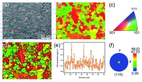 (a) Backscattered electron (BSE) image; (b) X-axis inverse pole figure (IPF) (parallel to the sample surface); (c) the standard color orientation reference system; (d) grain identified from the IPF map with a 2° orientation threshold; (e) point-to-point misorientation profile along the white line in (d); (f) pole density figure. The color bar represents multiples of random distribution of orientations. Reprinted with permission from Ref. [152]. Copyright 2021 Royal Society of Chemistry.