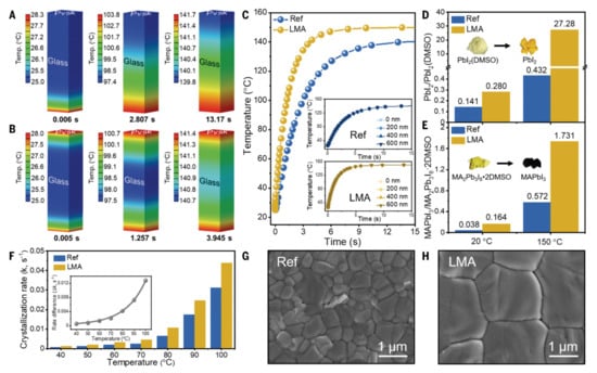 Finite element analysis on the thermal field distribution with annealing time with the Ref process (A) and the LMA process (B); (C) temperature evolution of perovskite film surface with annealing time. Inset: Temperature evolution of perovskite film at different depths; (D) relative content of PbI2/PbI2 (DMSO) under the Ref and LMA processes at 20 °C for 20 min or 150 °C for 10 s, expressed as the ratio of the XRD peak areas for the PbI2 and the PbI2 (DMSO) signals; (E) relative content of MAPbI3/MA2Pb3I8·2DMSO under Ref and LMA processes at 20 °C for 20 min or 150 °C for 10 s; (F) crystallization rate (k) of spin-coated FA1−x−yMAxCsyPbI3−zBrz film under different temperatures (40 to 100 °C) calculated from in situ ultraviolet–visible results. Inset: Crystallization rate difference (Dk) between the Ref and LMA processes (Dk = kLMA−kRef). (G,H) The SEM images of films under the Ref and LMA processes. Reprinted with permission from Ref. [164]. Copyright 2021 Science.
