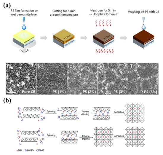 Taylor et al. chose polystyrene (PS) as the encapsulation layer during the annealing process [129]. PS was spin-coated directly onto the wet substrate and washed off by CB after annealing (Figure 16a). The SEM results showed that the growth of the films can be controlled by varying the concentration of PS. The aggregation of grains was more obvious at concentrations above 2%, and larger grain sizes were obtained at higher concentrations. The encapsulation layer would suppress the appearance of δ-phase perovskite, while increasing the grain size of α-phase perovskite. However, this annealing method required the introduction of a layer with the specified thickness, which may not be required in the device structure. The effect of the residual film layer on the PCE and stability of the device was not negligible, and a study of the grain growth on the surface which is in contact with the encapsulation layer during the annealing process is still needed. A possible effect could be detrimental carrier transport between the perovskite layer and the transport layer.