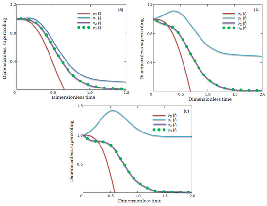 Figure 1 illustrates dimensionless supercooling to the dimensionless time t. If the melt was initially supercooled (see Figure 1a,b), the rate of supercooling removal is high (this can be explained mathematically by the inflection point in the Figure 1b for small t). Otherwise, and in Figure 1b,c show that the initially fast rate of metastability removal decreases with time as nucleation slows and coarsening of existing crystallites continues.