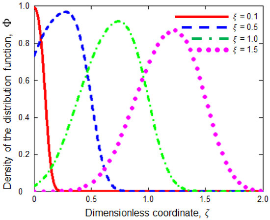 Figure 2 represents the evolution of the dimensionless density of the distribution function . It can be seen that weak inflection points appear as time increases. This means that the high nucleation rate is typical for the initial stage of the process when supercooling/supersaturation is close to the value . The nucleation process is followed by coarsening of the crystallites, which reduces the metastability degree of the system, slows down the intensity of nucleation, and leads to inflection points on the density graphs of the distribution function. It is important to note that such behavior was previously observed in experiments (see, for example, [55,56,57,58]).