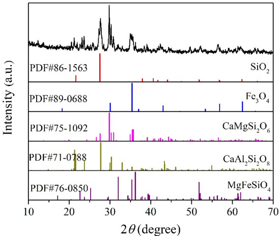Figure 1 shows the XRD patterns of the olivine basalt. From the XRD diagram, it is shown that the olivine basalt is mainly composed of plagioclase (CaAl2Si2O8), pyroxene (CaMgSi2O6), quartz (SiO2), olivine (MgFeSiO4), and magnetite (Fe3O4). Figure 2 shows a petrographic microanalytical diagram of the olivine basalt. The main minerals are pyroxene, olivine, plagioclase, and small quantities of altered minerals, serpentine, chlorite, and calcite. The main metal minerals are magnetite and ilmenite, and there are small quantities of pyrite and chalcopyrite. Most pyroxene is present as a monomer, and its shape is columnar, strip, granular, and irregular. A small quantity of pyroxene will be associated with iron minerals and other gangue ores. Plagioclase is generally plate-like, strip-like, and granular, and iron mineral inclusions can be seen in a small quantity of granular plagioclase. Magnetite, ilmenite, pyrite, chalcopyrite, etc. are generally fine-grained and irregular. Most of them are dissociated monomers. A small amount is connected with gangue minerals or is wrapped in gangue minerals. There is a small amount of dusty, fine-grained iron minerals embedded in the cleavage and the cracks of pyroxene and olivine, which are iron minerals precipitated by the alteration of iron–magnesium minerals.