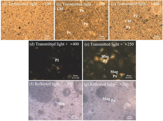 Microfacies of the OB; Px is pyroxene, PI is feldspar, Chl is chlorite, and Mag is magnetite.