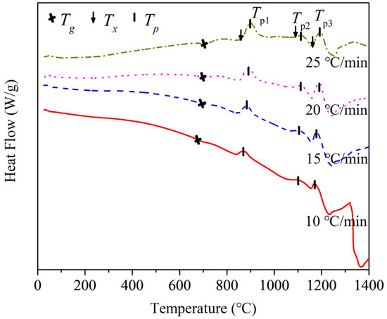 Figure 3 shows the DSC curves of the olivine basalt glass heated from room temperature to 1400 °C with different heating rates. All the curves are characterized with one endothermic peak and three exothermic peaks. The endothermic peak is related to the glass transition phenomenon of olivine basalt glass, and the exothermic peaks correspond to the crystallization that occurred at the peak temperature. The corresponding crystallization temperatures are given in Table 2 [12,13].