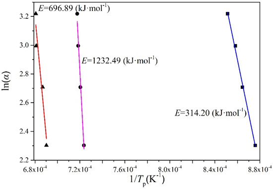 The linear -lnα versus 1/Tp plots of the above-mentioned three crystallization peaks are shown in Figure 4. The values of E for the three crystallization peaks obtained from slopes of straight lines according to Equation (3) are 314.20 kJ/mol, 1232.49 kJ/mol, and 696.89 kJ/mol, respectively. It can be found that the E value around 1110 °C is the largest. It is known that the crystallization activation energy refers to the activation energy required to overcome the energy barrier during the rearrangement of structural units when the glass melt is converted from a glass state to a crystal state. The higher E value around 1110 °C means that the rate of the nucleation and crystal growth process near this temperature is small, and crystallization is retarded. The lower E value around 1180 °C means that crystallization will be favored at high temperatures, and may be related to the fact that atoms have enough energy to overcome the energy barrier during the rearrangement of structural units at high temperatures.