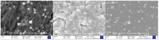 Figure 6 shows the SEM images of olivine basalt glass heat-treated at different crystallization temperatures. Table 5 gives the chemical components of the typical crystal phases obtained from energy spectrum analysis. XRD analysis provides information on the bulk of the sample, while EDX is limited to a small part of the sample, so some components cannot be fully reflected in Figure 6. For the samples heat-treated at 860 °C, it can be observed in Figure 6a that there are many ~2 μm granular skeletal crystals immersed in the glass matrix, which correspond to the pyroxene phase according to the EDX analysis. As shown in Figure 6b, no pyroxene phase can be observed for the samples heat-treated at 1100 °C, and the precipitated crystal phase is Fe2MgO4. For the samples heat-treated at 1180 °C (Figure 6c), many crystalline phases appeared on the surface with a size of 1–2 μm. Skeleton crystals and microcrystals can be observed, and the grain edge and surface are relatively well developed. The shape is mostly square. This should be related to the smaller viscosity of olivine basalt glass at higher heat-treated temperatures. Additionally, according to the atomic composition of the crystallization phase, X-ray crystallography, and EDX analysis, the crystals correspond to Fe2MgO4.