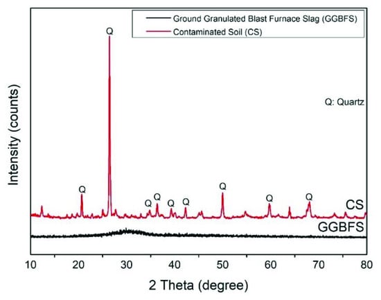 The ground granulated blast furnace slag (GGBFS) used in this study was collected from the CHC Resources Corporation located in central Taiwan. The GGBFS obtained has been ground to fine powder form, and no further treatment was needed. The contaminated soil (CS) was obtained from a pollution control site announced by the government in eastern Taiwan. The chemical compositions of CS and GGBFS were analyzed and listed in Table 1. The CS mainly contains SiO2, Al2O3, and CaO. The GGBFS contains 57.62% CaO. The concentration of heavy metals in soil is listed in Table 2. It includes EPA announced value and soil samples excavated on site. The difference is due to the sampling by this study being about two years after EPA announcement. The particle size analysis shows the d50s (mean particle size) of CS and GGBFS are 224.0 μm and 13.17 μm, as shown in Figure 1. The phase analyses of spectrum of CS and GGBFS are shown in Figure 2. The amorphous phase and particle size of GGBFS can be clearly identified in Figure 2 and Figure 3.