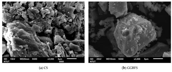 SEM analysis is to examine and compare the degree of geopolymerization of the specimens prepared with different alkali solutions by identifying the fissures, geopolymer matrix and dense/loose structure on the specimen surface. The solidifying of CS in the geopolymer gel can also be visualized through SEM morphologies. The fragment obtained from the compressive strength tests were used for this analysis because it can reveal the inner structure of geopolymer but the surface of cylindrical specimen [,]. The sample size is about 5 mm. It was dried in the oven and then Au sputter coating for conductivity. The magnitude is at 1000 time. The accelerating voltage is set at 15 KV.
