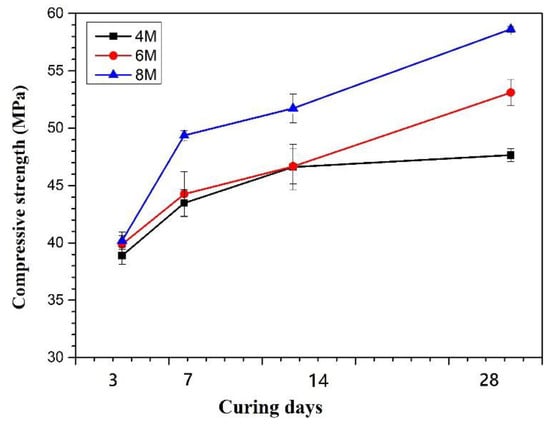 The compressive strength of specimens of Na04, Na06, and Na08 specimens are shown in Figure 4. The measurements were conducted after specimens were cured after 3, 7, 14, and 28 days of curing. After 3 days of curing, the compressive strength of all specimens is between 38.90 MPa~40.19 MPa. It demonstrates the molarity of NaOH has no obvious influence on the strength of geopolymer at the early curing stage. After 7 days of curing, the specimens prepared with higher molarity of NaOH have higher strength than those prepared with lower NaOH solutions. The strength of Na04 increases from 38.90 MPa to 43.48 MPa as curing time increases from 3 to 14 days. After being cured for 3, 7, and 14 days, Na04 and Na06 have similar strengths. This is probably due to both specimens having the same speed of geopolymerization process in the early curing stage. After 28 days of curing, NA06 develops a more dense C-A-S-H structure and results in higher strength than that of Na04. For the Na04 specimen, its strength only slightly increases from 46.6 MPa to 47.66 MPa. It can be attributed to the fewer Si and Al ions being dissolved from GGBF, thus hindering its strength development. For the Na08 specimen, its strength can reach up to 58.63 MPa after 28 days of curing. This is believed to be due to the higher molarity of NaOH can lead to more Si and Al ions dissolved from GGBFS and form more precursors that is required for geopolymerization [,,].