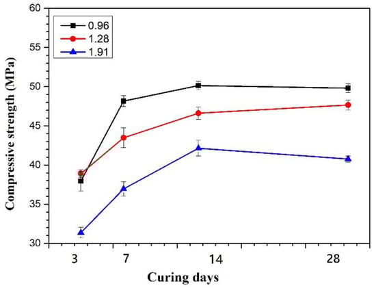 The effect of the SiO2/Na2O molar ratio in the alkali solution on the compressive strength of specimens is shown in Figure 6. The SiNa096 and SiNa128 have almost the same strength in the early 3 days curing stage. After 14 days of curing, it was found that SiNa096 has much higher strength than SiNa1.28 and SiNa1.91. After 28 days of curing, the strength of SiNa096 and SiNa128 can reach 49.80 MPa and 47.66 MPa. For SiNa191, its strength is generally about 10 MPa lower than SiNa096 and SiNa128 at each curing stage. This is because too many Si ions exist in the geopolymer gel at a high SiO2/Na2O molar ratio and then quickly form short Si–O bonds or ring-type Si–O–Al bonds. These bonding cannot link to geopolymer 3D structure and thus reduce its strength [].