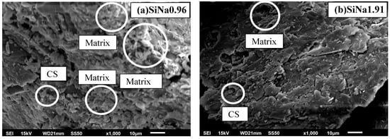 Figure 7 shows the SEM morphologies of SiNa096 and SiNa191. For the SiNa096 specimen, Figure 7a, a dense geopolymer matrix can be clearly seen, and CS particles are tightly encapsulated. On the contrary, SiNa191 has a sheet- or flake-like surface and relatively loose structure. These findings can also be related to the compressive strength results shown in Figure 6.