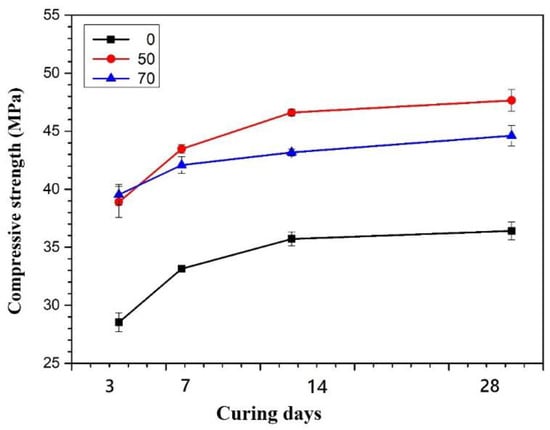 The compressive strength test results of SiAl00, SiAl50, and SiAl70 specimens are shown in Figure 8. After 3 days of curing, the compressive strength of SiAl00 is 28.54 MPa, but SiAl50 and SiAl70 can reach 38.9 MPa and 39.53 MPa, respectively. At every curing stage, SiAl00 also has much lower strength than SiAl50 and SiAl70. This is probably due to the low Al2O3 content (10%) of GGBFS that cannot provide sufficient Al ions to form Si–O–Al frame structure during geopolymerization reaction. Therefore, more Si–O–Si frame structure is formed but is not favorable for developing their strength []. For SiAl70, after 7 days of curing, its strength reduces from 44.08 MPa to 43.17 MPa at 14 days and 39.97 MPa at 28 days.