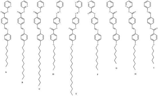 A comparative study of the prepared compounds with the reportedly structurally similar compounds E, F, G, H, and I was carried out to explain the effect of the mesogenic core and its orientation on the mesomorphic behavior. It is clear from Figure 4 that compound D is non-mesomorphic. It is worth noticing that the mesophase ranges of compounds A (15.92 °C), B (13.9 °C), and C (13.28 °C) are decreased by increasing the length of the terminal alkyl chain. This could be attributed to alkyl group disorder. The longer alkyl group may result in insufficient space between the layers for the terminal chains to accommodate, causing the layers to be parted. This could reduce the overlap of aromatic rings and the interactions between distinct mesogenic groups, which are essential for the development of the nematic mesophase [19]. On the other hand, the absence of the mesophase for compound D could be due to the presence of the electronegative nitrogen heteroatom in the middle ring of the compound. Conversely, its analogue E compound, which has the nitrogen heteroatom in the terminal outer ring, exhibits a smectic A mesophase with a wide range of thermal stability (25.4 °C). It could be explained in terms of the higher degree of charge separation in compound E compared with its analogue D. The presence of the terminal pyridyl ring affords a higher packing pattern compared to that of the compound D to show a smectic mesophase. It is also observed that compounds F, H, and I possess nematic phases and their mesophase ranges are increased in order H (14.17 °C) < F (45.6 °C) < I (46 °C). Moreover, compound G has a high smectic A mesomorphic range (20 °C). On the other hand, it is worth noting the change in the nematic mesophase range by comparing all compounds discussed. For example, F and I have a broad nematic range, while A, B, and C have a short nematic mesophase range. It is clear that longitudinal diffusion is not favored for long alkyl chains.