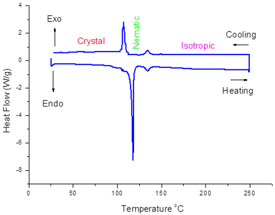 The phase transitions in the materials were determined via differential scanning calorimetry (DSC), DSC-60A, Shimadzu, Kyoto, Japan. Here, 2–3 mg specimens were encased in aluminum pans and heated or cooled in a dry nitrogen environment. The temperature was measured at a rate of 10.0 °C/min. Under an inert nitrogen gas atmosphere, samples were heated from room temperature to 200 °C and then cooled back to room temperature at the same rate. The endothermic peak minima of enthalpy in the heating curves were used to calculate the phase transition temperatures. Temperature monitoring accuracy was better than 1.0 °C.