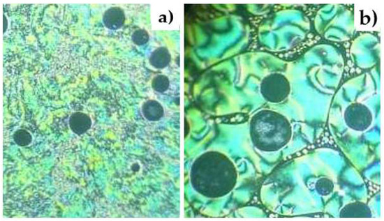 The phase transitions of all synthesized compounds were studied by differential thermal analysis (DSC), and the mesophase types were recognized by observing their textures through polarized optical microscopy (POM). DSC was used to measure the phase transition temperatures (°C), their enthalpy of transition ΔH (kJ/mol), and their normalized entropy of transition ΔS/R. The results that were derived from DSC measurements and verified by POM are given in Table 1. A representative example demonstrating the DSC thermogram of heating/cooling processes for compound A is shown in Figure 2. The results of the POM showed enantiotropic nematic mesophases for all prepared compounds. The existence of sharp peaks in the DSC thermogram indicates the phase transition between the crystal phase and the liquid crystalline phase. Moreover, the small peaks signify the transition from the liquid crystalline phase to the isotropic liquid. The observed mesophase textures for compounds B and C are provided as examples in Figure 3.