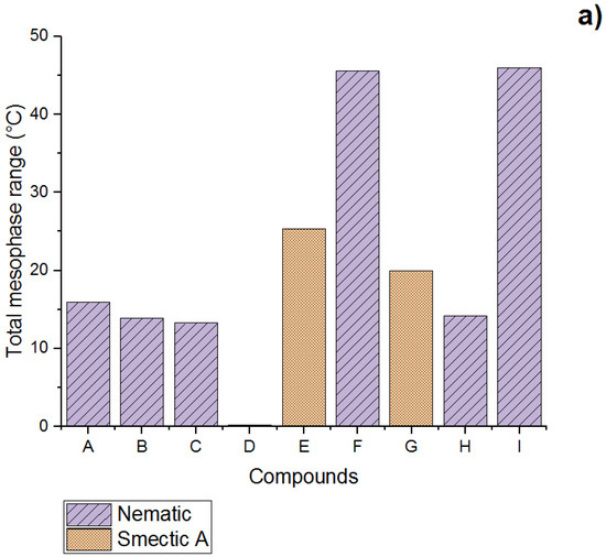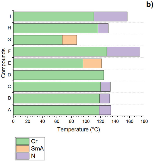 Graphical representations of (a) mesophase ranges of all investigated compounds A, B, C, D, E, F, G, H, and I; (b) mesophase temperatures in terms of the compounds.