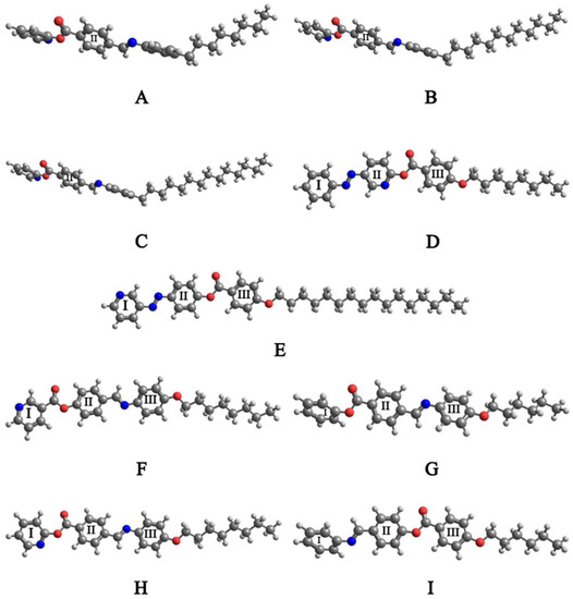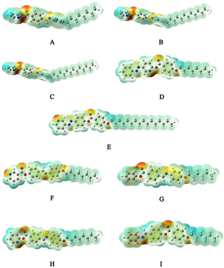 The electron density at the atomic sites of the studied compounds has a significant impact on the dipole moment, polarizability, and electronic structure. Moreover, the molecular electrostatic potential (MEP) is a useful tool to analyze the electron density distribution in the molecule and is considered an effective method for predicting intermolecular interactions. Thus, the charge distribution map of the compounds was computed by the same method, using the same basis set, according to molecular electrostatic potential (MEP) and is illustrated in Figure 9. The most negatively charged sites are colored in red, whereas the least negatively charged are colored in blue. It is obvious that the negatively charged sites are those with high numbers of electronegative nitrogen and oxygen atoms in the mesogenic cores, such as Schiff base portion (-CH=N-), azo group (-N=N-), and carboxylate ester (COO). On the other hand, the terminal chain is the least negatively charged site. It is noticed that the length of the terminal alkyl chain may have an insignificant effect on the charge distribution of the aromatic ring moieties, as seen in the A, B, and C compounds. Moreover, the charge map distribution is affected by the orientation and position of the mesogenic core, which could influence the type and the temperature range of the mesophase by varying the competitive interaction between terminal interaction and lateral interaction. The distribution of terminal charge for the F and I compounds permits the head-to-tail interaction to develop the nematic mesophase, whereas the high charge separation for the E compound enhances the side–side interaction, resulting in the formation of the more ordered smectic mesophase. In the same context, the accumulated negative charge in the center of the D compound reduces the lateral in addition to the terminal interactions, which could explain the non-mesomorphic behavior.