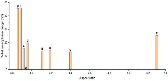 Graph of mesophase range versus aspect ratio of A, B, C, D, E, F, G, H, and I compounds.