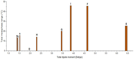 Graph of mesophase range versus total dipole moment of A, B, C, D, E, F, G, H, and I compounds.