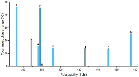 Graph of mesophase range versus polarizability of A, B, C, D, E, F, G, H, and I compounds.