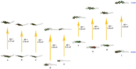 The highest occupied molecular orbital (HOMO) and the lowest unoccupied molecular orbital (LUMO) are the two frontier molecular orbitals (FMOs). The HOMO is an electron donor, whereas the LUMO is an electron acceptor. The energy gap is the difference in energy between them, which may indicate the electron transition capability. Furthermore, it is inversely proportional to the molecules’ reactivity. The energies of the compounds’ HOMO and LUMO orbitals were computed using the same method and the same basis set. The results are tabulated in Table 5 and the isodensity surface plots for the ground state FMOs are illustrated in Figure 10. One can conclude from the results that the polar alkoxy terminal chain significantly lowers the energy gap of FMOs compared to the non-polar alkyl chain, although it does not influence the location of the FMOs’ electron densities. Additionally, the aromatic rings have most of the electron densities of the sites that form the HOMOs and the LUMOs. In the same approach, the coplanarity of compound E caused by the azo group enhances the conjugation of the aromatic rings, thus decreasing the energy gap of FMOs. Furthermore, the energy gap is greatly affected by the position and the orientation of the mesogenic cores (-CH=N- and COO), as seen in the G and I compounds, which could be attributed to the high degree of conjugation in the G compound. On the other hand, the changing of the terminal chain length has no effect on the energy gap value, as seen in the A, B, and C compounds.