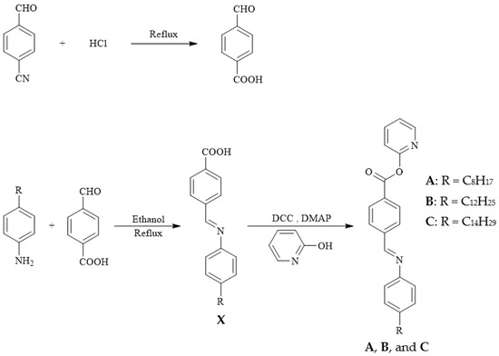 In this study, 4-Formylbenzonitrile (95%) and N,N′-dicyclohexylcarbodiimide (DCC) (99%) were purchased from Sigma Aldrich (Shanghai, China); 4-octyl aniline (97%) and 4-dodecylaniline (97%) were purchased from Sigma Aldrich (Verona, WI, USA); 4-tetradecylaniline (97%) was obtained from Sigma Aldrich (Delhi, India); 2-hydroxy pyridine (98%), 4-dimethylaminopyridine (DMAP) (98%), dichloromethane (99.8), HCl (38%), and ethanol (95%) were purchased from Sigma Aldrich (Homburg, Germany).