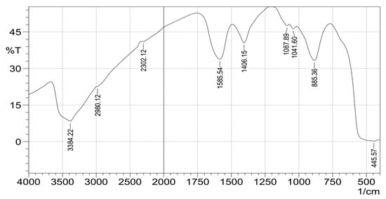 The FT-IR spectra of Er-ZnONPs are illustrated in Figure 3. The stretching bands at 3384 cm−1 were due to the OH stretching vibration band. Thus, the presence of phytochemicals, such as polyphenols, on the surface of colloids makes the synthesized metallic nanoparticles stable, as well as acting as a capping agent [23,24]. The peak at 2980 cm−1 agrees with the C-H stretching of the asymmetry vibration. The peaks at 1585 and 445 cm−1 belong to Zn–O stretching and deformation vibration, respectively [25]. The functional groups present in the extract were determined by LC/MS (Table 1).
