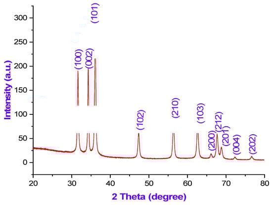 The crystalline nature of the Er-ZnONPs was confirmed by an X-ray diffraction (XRD) pattern. Distinguishing peaks at (2θ) angles of 31.77, 34.43, 36.26, 47.55, 56.60, 62.88, 66.39, 67.96, and 69.10°, accompanied by indices of (100), (002), (101), (102), (210), and (103), respectively, were observed, as shown in Figure 5. The XRD spectra of the Er-ZnONPs showed that the synthesized nano-ZnO had a hexagonal shape and matched with the card no. COD 2300450 pattern reported by M. Schreyer et al. in 2014 [26]. The particle size average was calculated, according to the Scherrer equation, to be 3.23 nm.