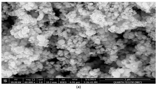The SEM image obtained for the Er-ZnONPs was used to explore the surface morphology, and it showed that the Er-ZnONPs particles were elongated, spherically agglomerated shapes with diameters ranging from 48 to 170 nm, with an average size of 87 nm (Figure 6a). The larger sizes observed by SEM were due to the agglomeration of the small nanoparticles together with the high resolution.