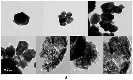 TEM studies were performed to investigate the nature of the Er-ZnONP particle sizes and their crystallinity. As shown in Figure 6a, the particles consisted of large hexagonal crystals of about 100 nm (Figure 6b). These hexagonal crystals contained small-particle aggregates with an average size of 3.47 nm. It should be noted that these data were similar to the X-ray results.