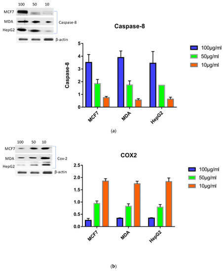 These results were due to the extract’s action on the surface of nanoparticles. E. retusa has been shown to contain anticancer metabolites, such as coumarines, flavonoids, ellagitannins, and phenolic acids [30,31,32,33]. An immunoblotting experiment using caspase-8 and COX-2 was used to investigate the mechanism of action. Caspase-8 is a protease from the caspase family that is involved in apoptosis during normal development and adulthood. The inactivation of caspase-8 has been seen in a range of human malignancies, which may enhance tumor development and resistance to existing treatments. As a result, caspase-8 appears to be a promising target for restoring tumors’ faulty apoptotic systems and overcoming resistance [34]. On the other hand, COX-2 is widely expressed in a variety of malignancies, where it plays a pleiotropic and multidimensional function in carcinogenesis and cancer cells’ resistance to chemotherapy and radiation. COX-2 is secreted into the tumor microenvironment by cancer-associated fibroblasts (CAFs), macrophage type 2 (M2) cells, and cancer cells (TME). COX-2 enhances the apoptotic resistance, proliferation, angiogenesis, inflammation, invasion, and metastasis of cancer cells by inducing CSC-like activity. COX-2-mediated hypoxia in the TME, as well as its favorable associations with YAP1 and antiapoptotic mediators, all help cancer cells withstand chemotherapy treatments [35]. Based on these findings, raising caspase-8 expression while decreasing COX-2 expression is critical in cancer treatment, battling resistance, and chemoprevention. The effects of increasing concentrations of Er-ZnONPs on levels of the caspase-8 and COX-2 proteins are shown in Figure 7a,b. Our results show clearly that Er-ZnONPs significantly increased the expression of the apoptotic protein, caspase-8 (Figure 7a), and significantly decreased the expression of the anti-inflammatory protein COX-2 (Figure 7b) in a dose-dependent manner. Our results demonstrate that apoptosis induction was among the mechanisms triggering the Er-ZnONPs’ inhibitory effects on the breast and hepatic cancer cell lines, since the Er-ZnONPs increased the caspase-8 expression in all the tested cell lines compared to the ß-actin. Furthermore, the results showed that COX-2 protein expression is deregulated after the cellular treatment of breast and hepatic cancer cell lines with Er-ZnONPs, demonstrating that Er-ZnONP are selective COX-2 expressions, and that their anti-inflammatory effects play a role in their chemotherapeutic action.