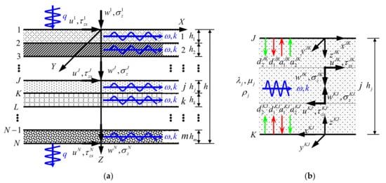 where is the imaginary unit; and denote the wavenumber along direction and the circular frequency, respectively; The caret “^” over a quantity stands for its counterpart in the domain. Due to the layering configuration of considered isotropic material, i.e., the thickness along axis being finite while the layering dimension along being infinite, the state vector of displacements and the state vector of stresses should be defined hereafter as the entire quantities involved in the surface/interface conditions. Thus, the state vector of the layer is within the framework of state–space formalism []. When the harmonic solutions in Equation (3) are substituted into Equation (1), and then all the strains and the stress in the resulting equations are eliminated, one obtains a system of ordinary differential equations governing the state vector: