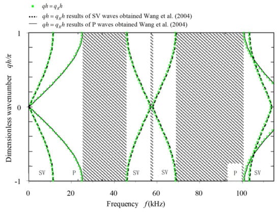 Consider the propagation of in-plane waves perpendicular to layering. In this case the in-plane waves are decoupled into pure P (primary) and pure SV (shear vertical) waves, whose frequency–real wavenumber (phase constant) curves calculated by the proposed MRRM are shown in Figure 2. For the convenience of comparison, the results computed by the MTM [] are also plotted in Figure 2. It is obviously seen that the dispersion curves obtained by the two methods agree very well.