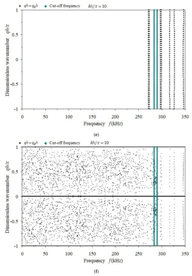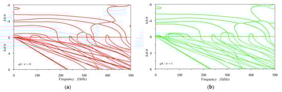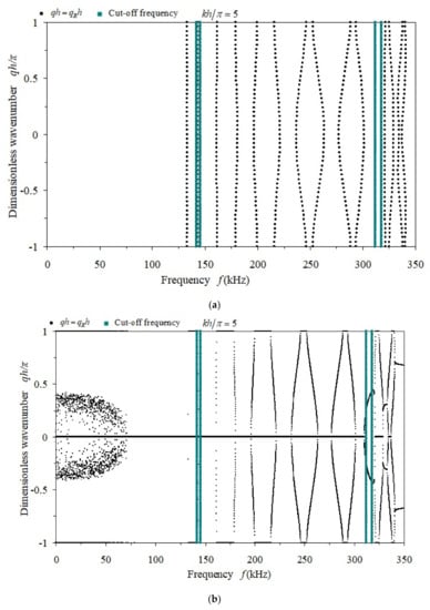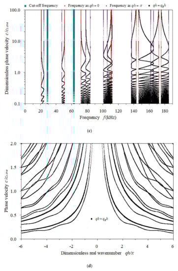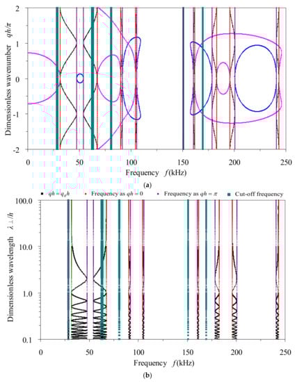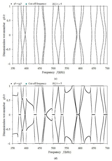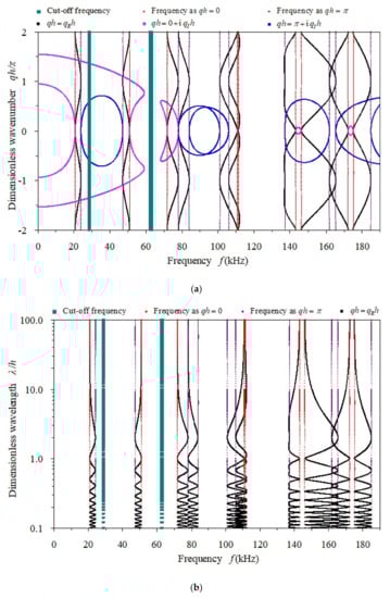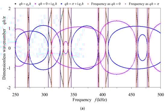 (2) The phase constant (real wavenumber)-related dispersion curves are symmetric regarding and periodic with the smallest positive period . The frequency–imaginary wavenumber (attenuation constant) dispersion curves in each stopband are also symmetric regarding but not periodic and are closed and cambered outwards curves.
